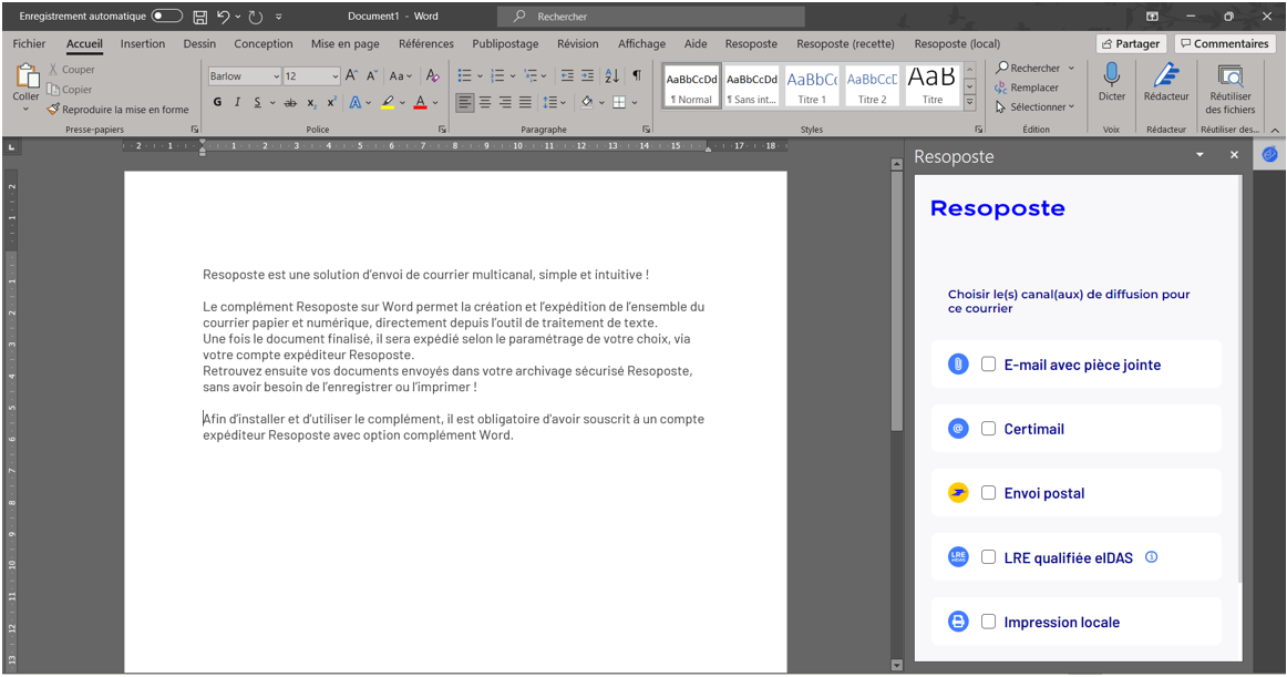 Le complément Resoposte sur Word permet de créer un courrier et de l’expédier sans quitter l’outil de traitement de texte.